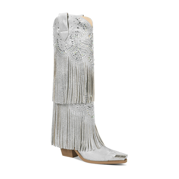 أحذية WETKISS مخصصة للحفلات في الركبة الغربية أحذية عالية لامعة من حجر الراين الفضي أحذية راعية البقر إصبع القدم الصلب شرابة أحذية رعاة البقر مع هامش