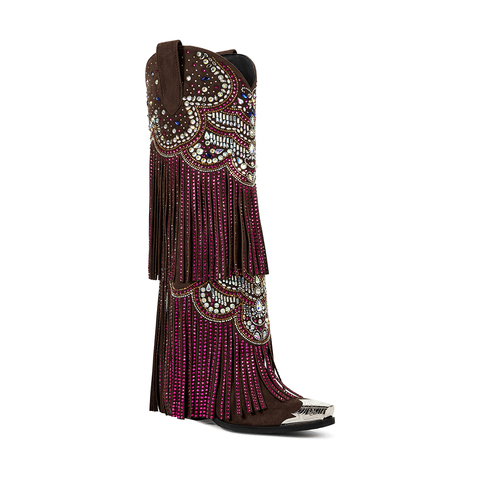 أحذية WETKISS مصنع تصنيع المعدات الأصلية كتلة الغربية كعب الركبة أحذية عالية الفاخرة حجر الراين راعية البقر أحذية هامش رعاة البقر الأحذية مع شرابة